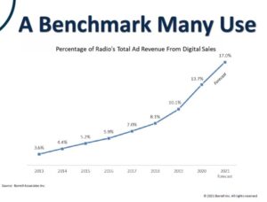 Flash back to 2013 and just 3.6% of radio revenues were generated from digital sales, according to the ninth annual Benchmarking Radio’s Digital Revenues report from Borrell Associates and the Radio Advertising Bureau. While low- to mid-single digit percentages are still the case for some broadcasters, the industry at large has awakened to the fact that digital ad budgets far exceed radio budgets. In 2020, 13.7% of radio revenues were derived from digital and that is on track to reach 17% this year.