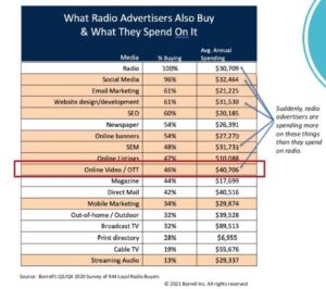 Streaming video, in particular, was hot in 2020 with the average local radio advertiser dropping $40,706 on online video marketing. Among the 24% of local advertisers that hit the brakes on radio and moved their money to something else, 31% bought online video ads, which Borrell called the “smoking gun” of the study. “There’s some pretty strong evidence that those who stopped buying radio last year moved it into online video,” he said. And those who continued buying radio in 2020 spent 70% more on online video (an average of $40,706) than advertisers that skipped radio. These advertisers planned to increase radio budgets less than half as much as radio buyers who don’t buy online video. Borrell chalked it up to radio advertisers that can’t afford TV ads and see online video as a more affordable substitute.