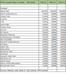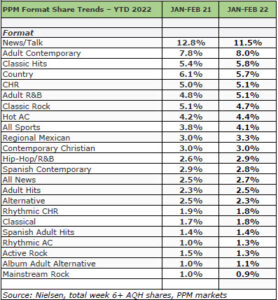 Two months into Nielsen’s PPM ratings measurements for 2022, noticeable format trends are starting to take shape. The news is good for classic hits and rhythmic AC, not so good for country and classic rock.