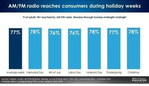 Indeed, AM/FM radio’s reach of adults 18+ is significant when it counts the most, according to Nielsen: 77% are reached by radio in the week leading up to Thanksgiving and Black Friday, with 78% are reached the week of Christmas. That makes AM/FM radio “the prime advertising vehicle for reaching shoppers trying to find last minute gifts,” Bouvard says.