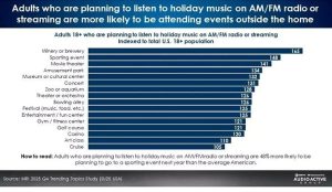 An MRI study shows that close to 80 million adults in the U.S. plan to listen to holiday music on AM/FM radio or streaming, with that listening peaking on the weekends. That research also shows that those listeners are more likely to participate in activities outside the home, meaning they’re likely to experience AM/FM radio ads while in their cars.