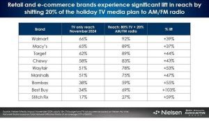 Retailers adjusting their media plan to spend more on AM/FM radio this time of year can experience the “20 gets you 50” effect, as in, shifting 20% to AM/FM radio generates a 50% incremental reach increase to their investment in linear TV, according to Nielsen Media Impact. Additionally, “shifting 20% of TV investment to a mix of AM/FM radio and podcasts grows reach by an average of +53%,” Bouvard says. “The smaller the retailer’s TV investment, the greater the incremental reach lift achieved with the addition of AM/FM radio.”