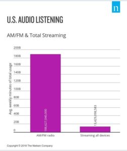 Adding up the total minutes for AM/FM radio and streaming audio equates to more than 202 billion minutes per week, with AM/FM representing 93 percent of total weekly minutes compared with roughly seven percent for streaming audio.